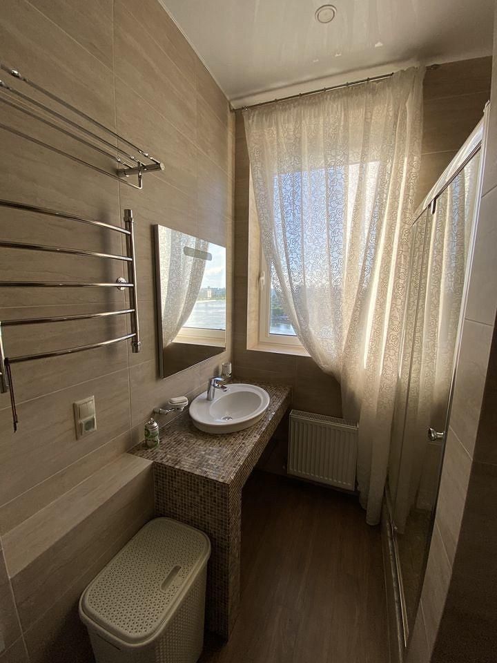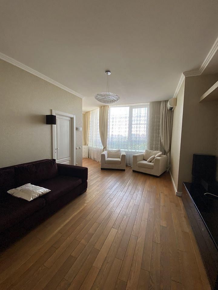 Квартира расположена на 14 этаже. Планировка квартиры: общая пл 130 кв м, кухня, гостиная , мастер-спальня со своей гардеробной и санузлом с окном на реку, две детские спальни, санузел с постирочной комнатой, прихожая.Высота потолков 3 м.