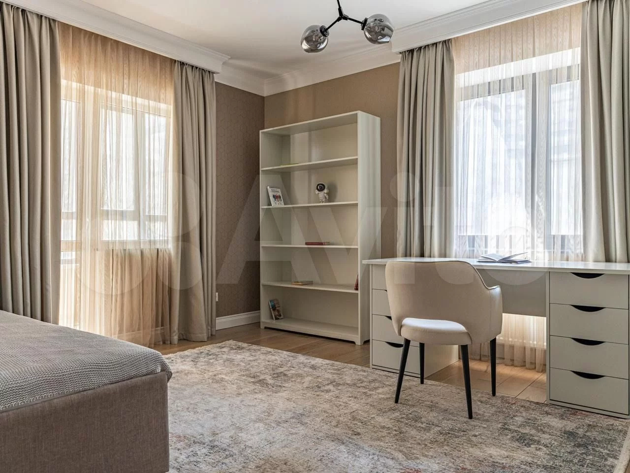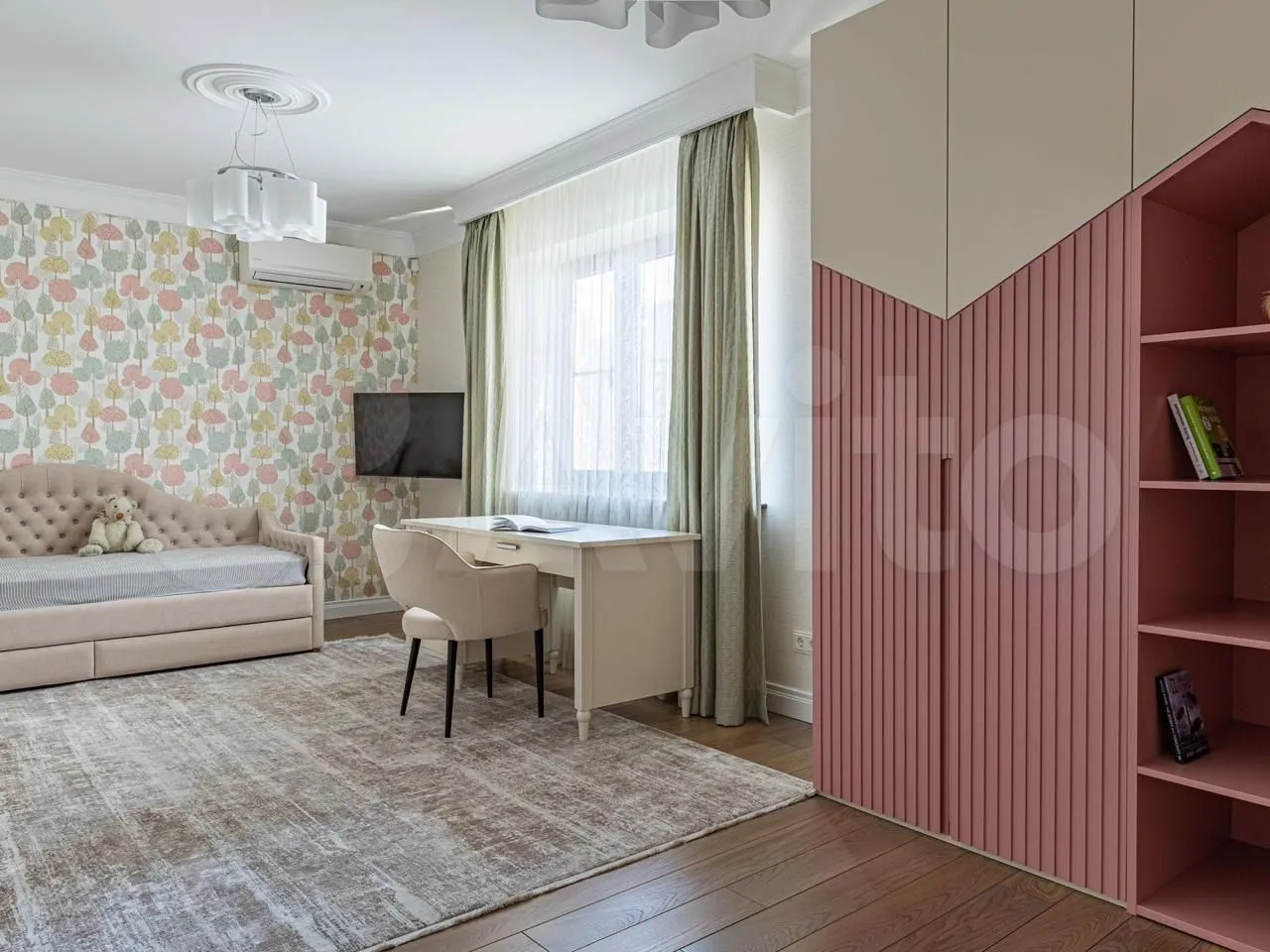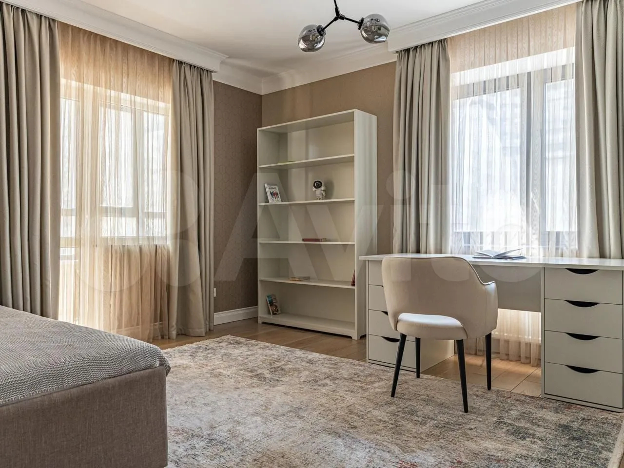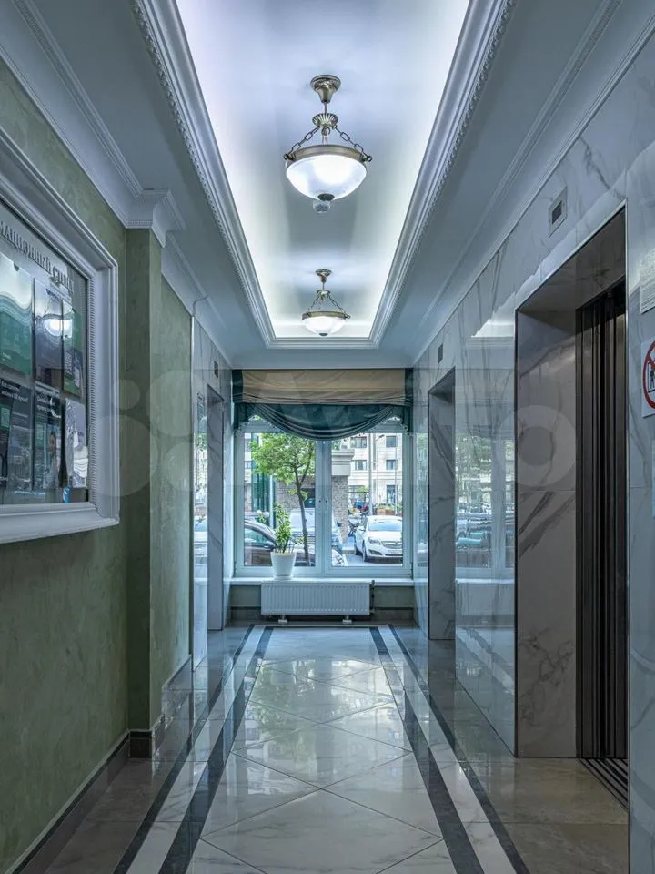 Площадь квартиры составляет 180 квадратных метров.Просторные окна создают ощущение света и пространства в каждой комнате. Из окон открывается прекрасный вид на улицу и во двор.