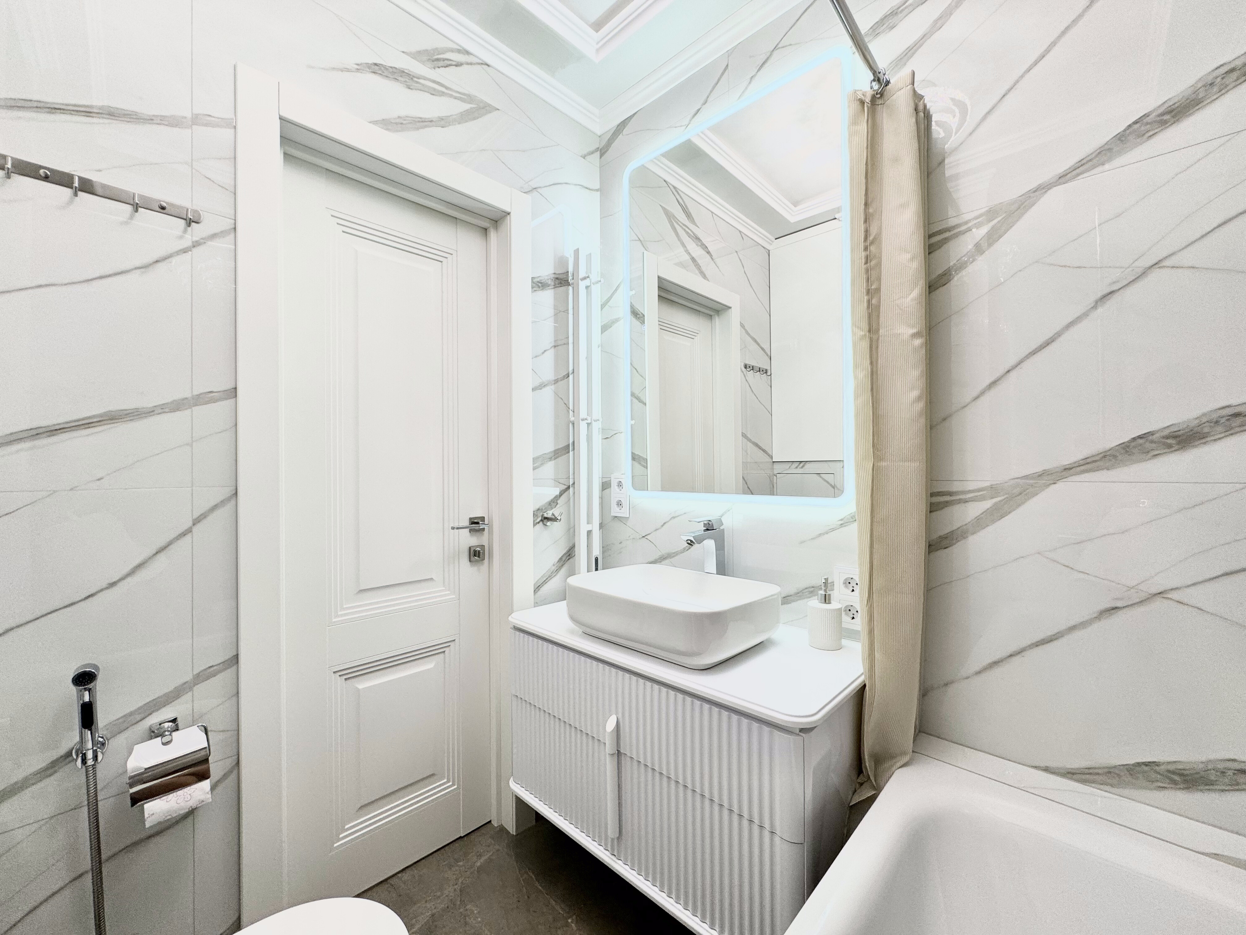 Стены во всей квартире стеклохолст, краска фирмы Dеrufа Сантехника Jасоb dеlаfоn, Франция Потолки во всей квартире из гипсокартона с подсветкой по периметру.