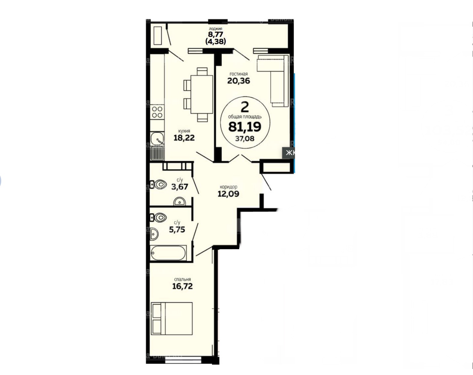 | Жилая площадь | 37 |