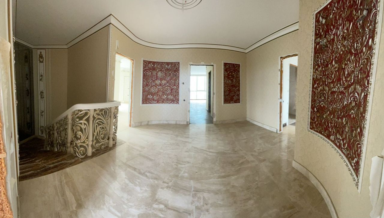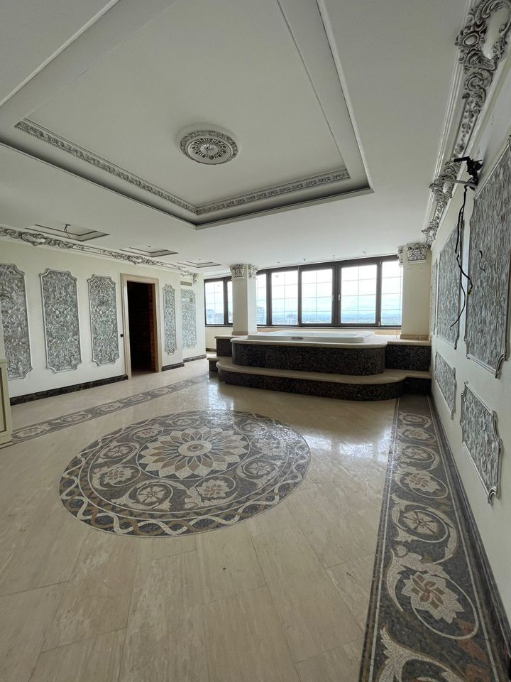 Планировка: общ.258 кв.м, 5 изолированных комнат и кухня-гостиная, 2 с/у,  витражная лоджия. На первом этаже общая зона: гардероб, кабинет, отдельная кухня, уголок для завтрака, гостинная с великолепными видами. На втором этаже: три спальни, одна из которых со своей ванной комнатой+ поражающий своими видами личный СПА-салон с джакузи, соляной комнатой, душевой, постирочной и местом под сауну. В квартире использованы только натуральные высококачественные материалы: камень, паркет. Высота потолков 3 м. Состояние квартиры - частичный ремонт.