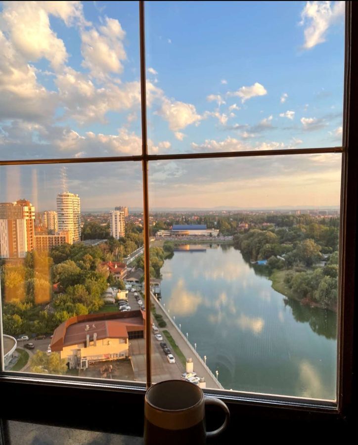 Двухуровневая Квартира расположена на 16 этаже. Из окон открываются потрясающие виды на историческую часть города и реку Кубань.