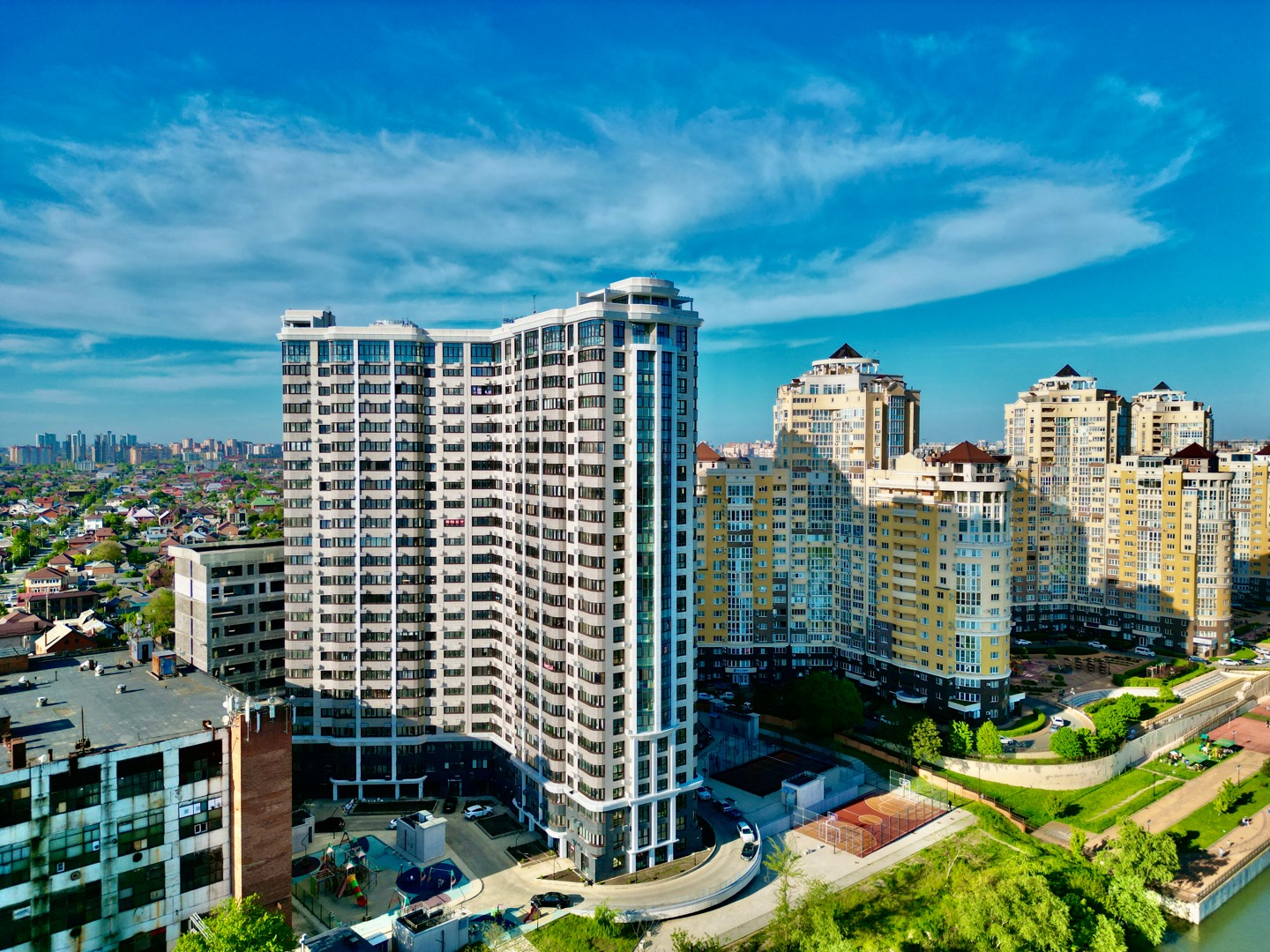 ЖК Европейский на улице Кожевенная. Комплекс расположен на расположен на первой линии реки Кубани. Этот квартал бизнес-класса спроектирован так, что окна большинства квартир выходят на набережную. На огороженной и охраняемой территории создано пространство для игр, отдыха и спорта с фонтанами и пешеходными дорожками.