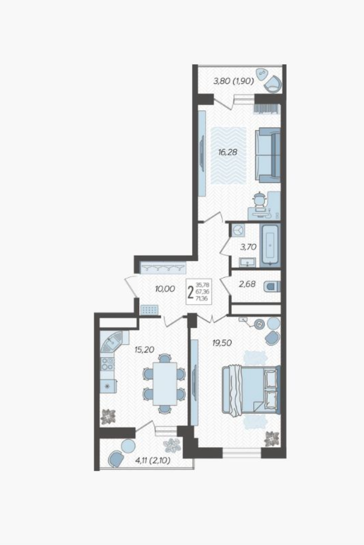 Закрытая территория комплекса. Квартира расположена на 10 этаже. Планировка: общ. S=72 кв.м, 2 изолированные комната и кухня-гостиная, с/у, просторная витражная лоджия. Состояние квартиры - предчистовая отделка от застройщика.