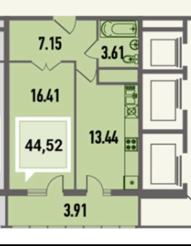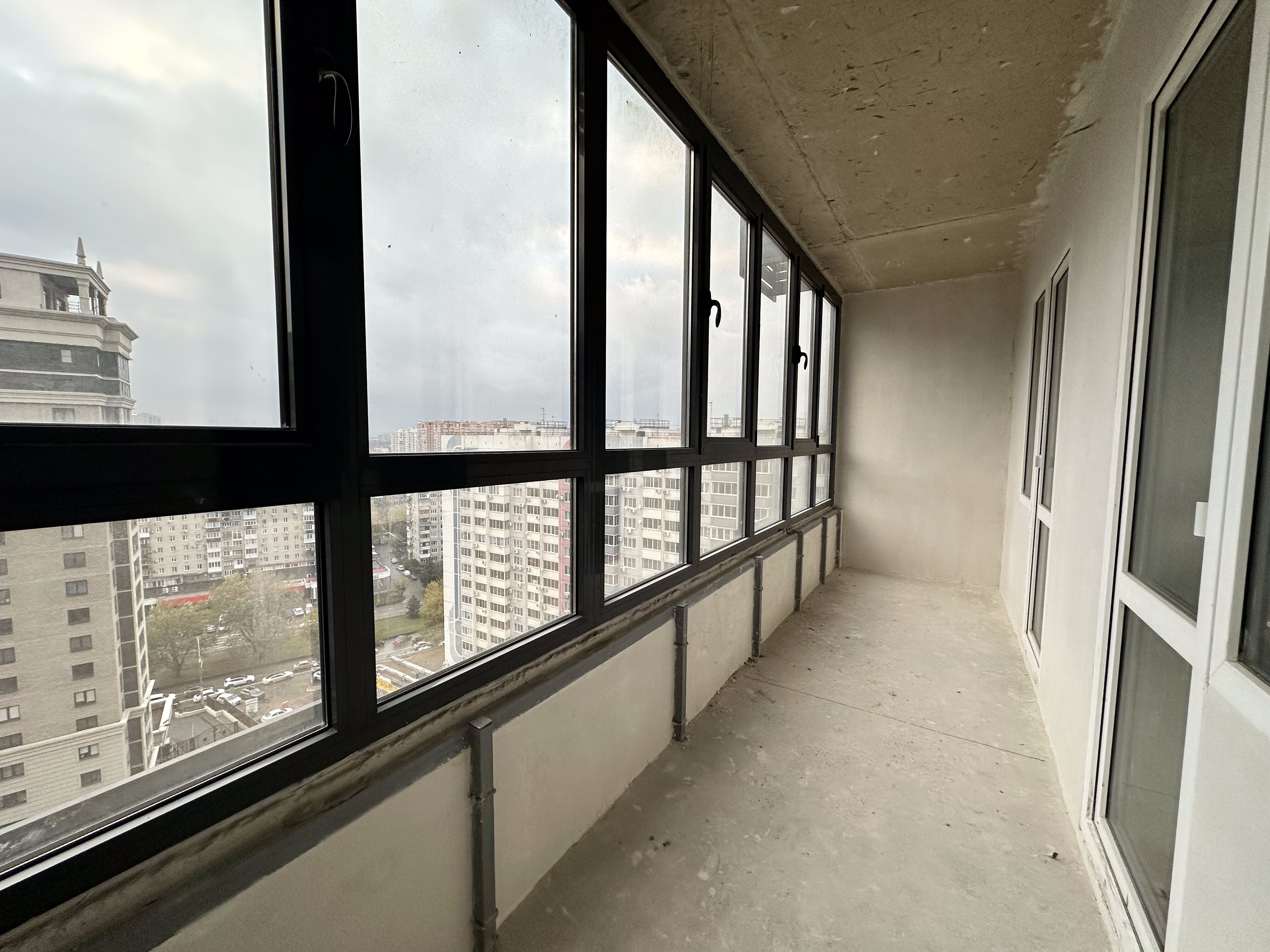 Планировка: общ. S= 45 кв.м, 1 изолированная комната и кухня-гостиная, с/у, просторная витражная лоджия. Состояние квартиры - предчистовая отделка от застройщика.